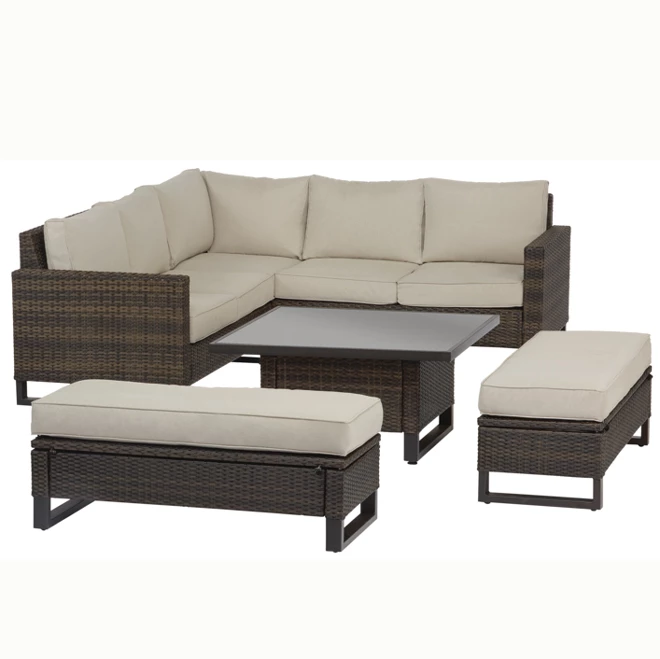 - Comprend un canapé complet, deux bancs et une table en verre à hauteur réglable