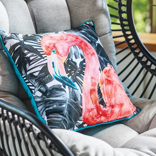 Apportez plus de vie à votre jardin ou tout espace extérieur avec ce coussin aux couleurs estivales. Le contraste de l’imprimé du flamant rose sur le fond noir et blanc évoque douceur et élégance. Ce coussin n’est pas déhoussable et se nettoie à la main.
