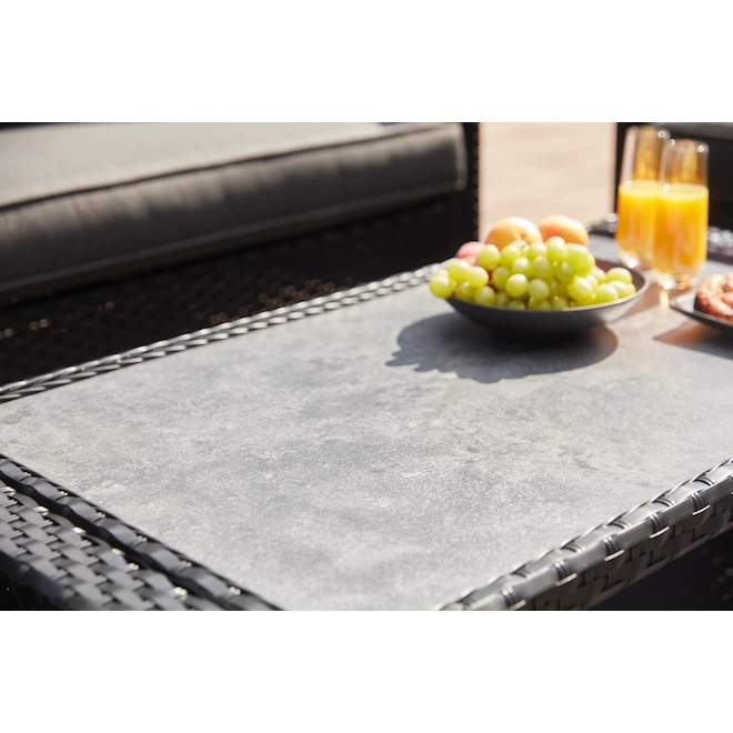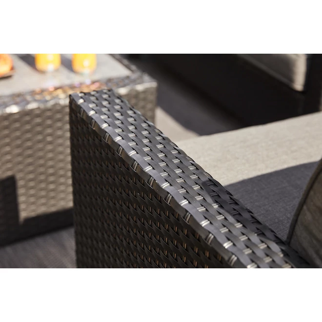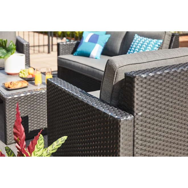 Tous les éléments de cet ensemble sont fabriqués en acier thermolaqué robuste qui résistera aux intempéries et en osier de polypropylène facile à nettoyer. Le tissu oléfine des coussins résiste également à l’eau et aux rayons UV. Cet ensemble de patio est garanti un an.
