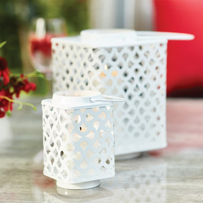 - Lanterne décorative d’extérieur de 9,25 pouces de hauteur en finition blanche, avec un design métallique classique