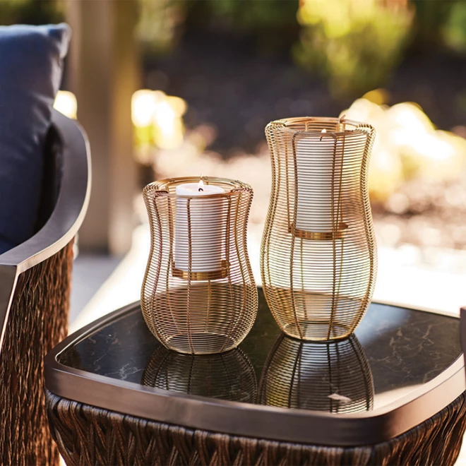 - Lanterne décorative d’extérieur de 9 pouces de hauteur en finition dorée, avec un design métallique classique