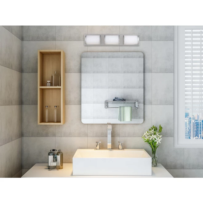 - D’une longueur de 22 pouces, cette barre d’éclairage pour meuble-lavabo conviendra mieux aux meubles-lavabos de taille moyenne de 24 à 30 pouces