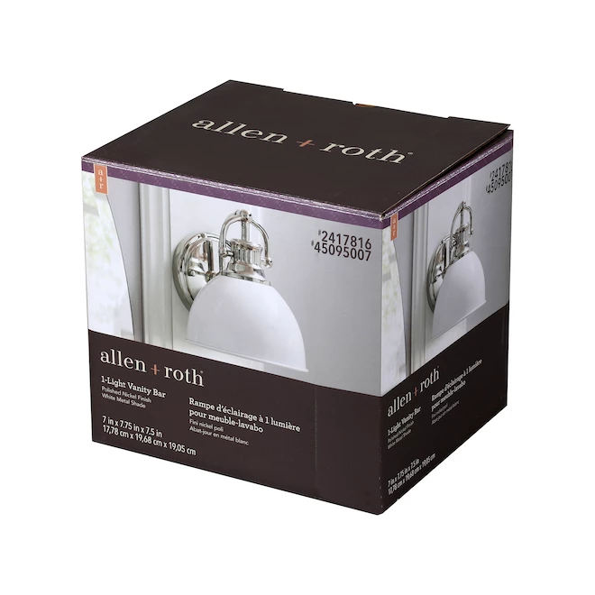 Soyez le premier à laisser votre avis sur “Luminaire mural pour meuble-lavabo au style moderne à 1 ampoule par Allen + Roth, 7 po, métal, nickel poli et blanc” Annuler la réponse