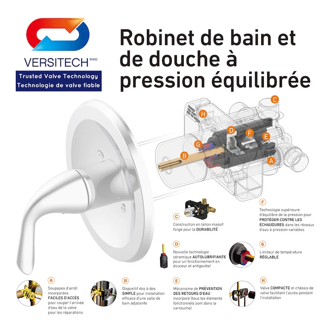 - Équipé d’arrêts intégrés qui permettent de fermer l’eau au niveau de la vanne. Comprend un bouchon de douche pour permettre une installation de douche uniquement
