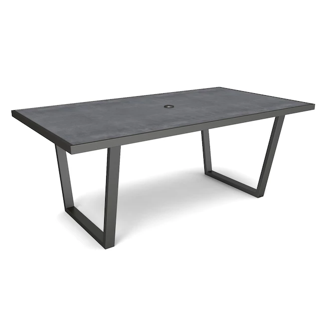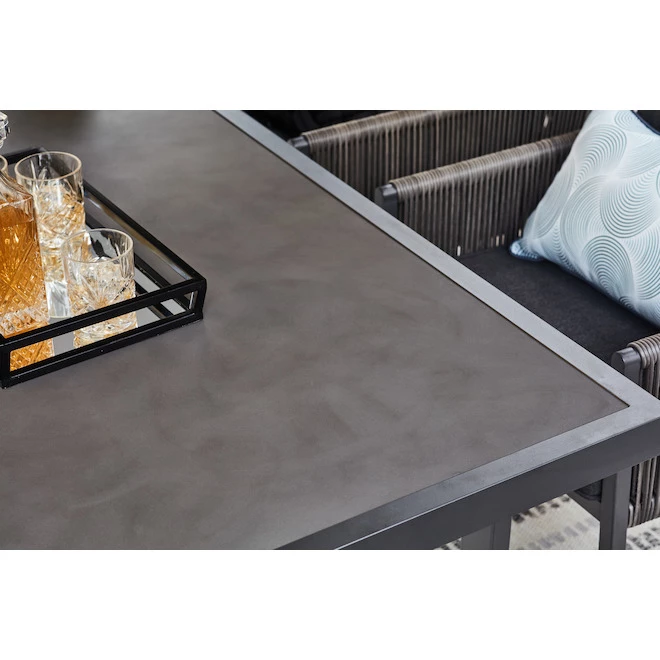 Cette table à manger est faite d’un cadre en acier robuste avec une finition grise. Elle a un look moderne et naturel avec son plateau en acier brossé aspect béton. Elle est également facile à assembler, les outils sont fournis et elle comprend un trou pour parasol inclus.